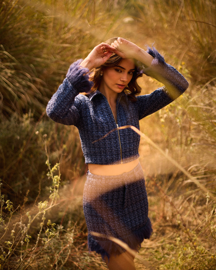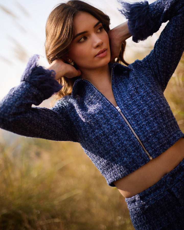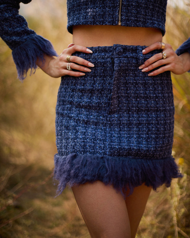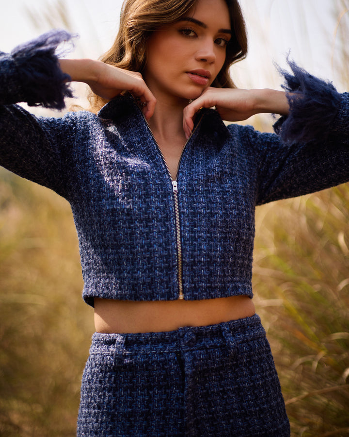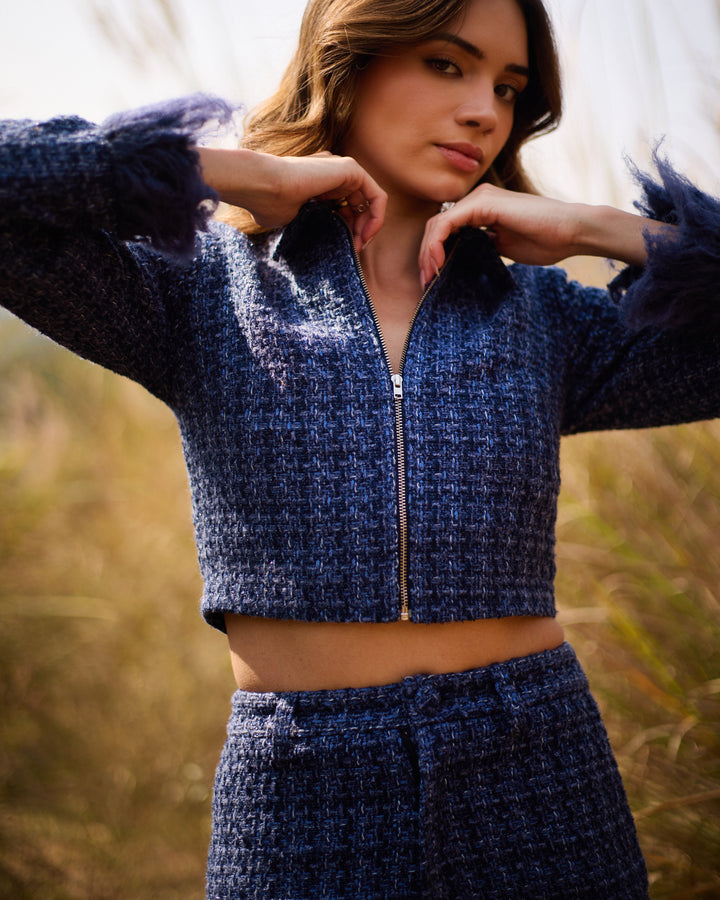 The Bluewood Fur-Trim Tweed Jacket is a luxurious layering piece that instantly elevates any ensemble. Crafted from richly textured, structured Cobalt Blue tweed, this cropped jacket features a classic shirt collar and a full front zipper. The sleeves are distinguished by soft, textural Fur Detailing at the Cuffs, adding a sophisticated accent and high-fashion finish perfect for cooler weather.